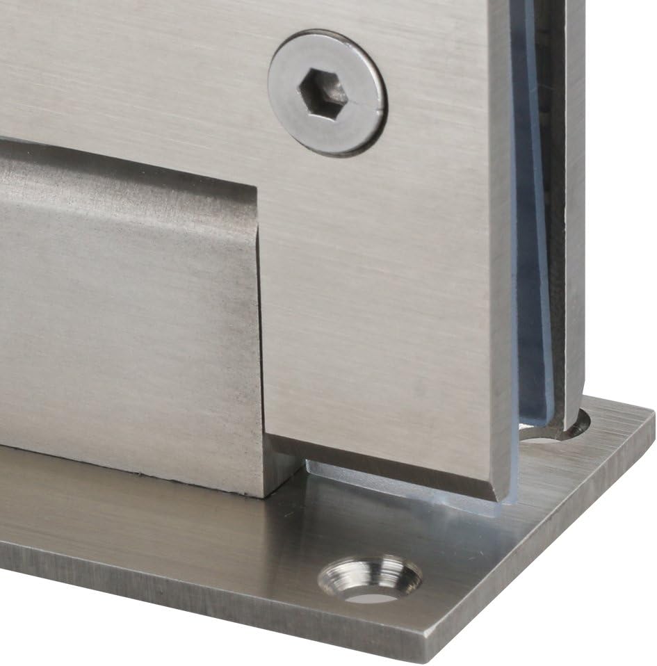 Frameless heavy glass shower doors hinge. 90 degree wall-to-glass, wall mount hinge. Self-closing solid stainless steel wall mount hinges Square edge, full back-plate. Designed for 3/8" tempered glass 2 Hinges - 80 lbs / Max Door Width: 30" 3 Hinges - 120 lbs / Max Door Width: 36" Including one hinge, 4 screws & expansion bolt, 4 lids and 1 Allen key in each box. Hassle-free returns. Life time limited warranty.